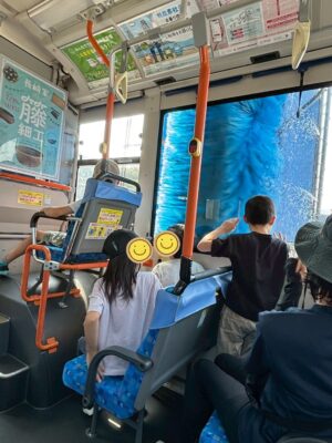 バス用の洗車機の中に入ると、窓いっぱいに吹き付けるお水と回転するブラシを見ることができ