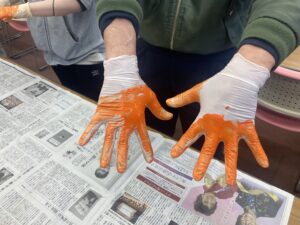 絵具を消毒液にみたてて、普段わたしたちがしている消毒の確認をしてみました。