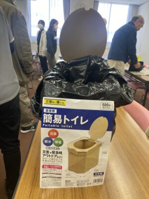 また、断水でトイレが使えないときのために簡易トイレに色つきの水を入れ、