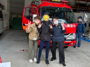 ↓ 消防車の前でかっこよくピース✌