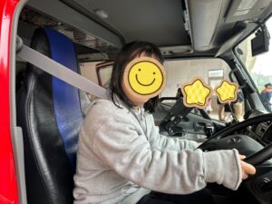 ↓ 運転席に座ってハンドルを持たせてもらってニッコリ☺