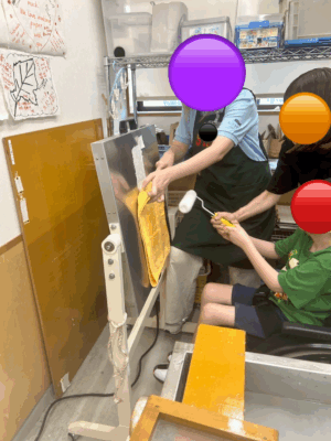 木枠から鉄の板に紙を張り付けてローラーで