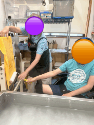 液体を混ぜたものを木枠ですいていきます