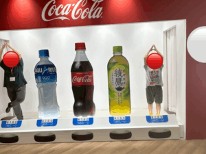 たくさんのコカ・コーラ製品が並ぶ棚をみて「僕これ好き」「これ知ってる」