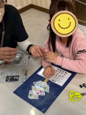 台紙の粉雪は、工作の得意な職員がブラシで絵の具をはじいて降らせました❄