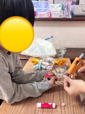仕上げはグルーガン でつけるため出来上がりを見守るお友だち